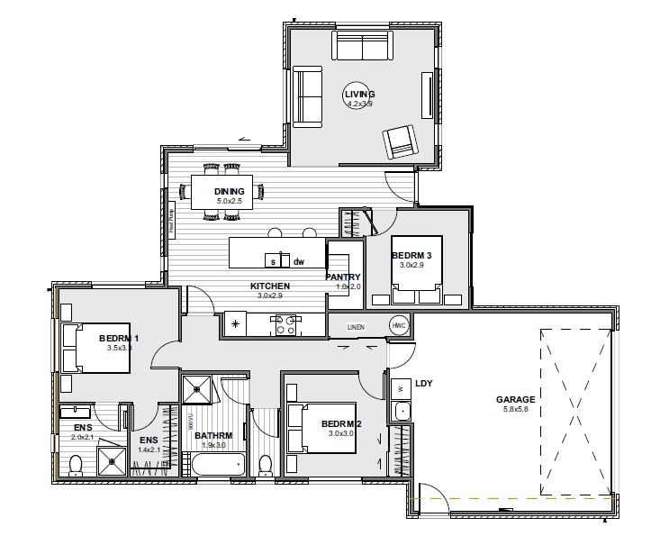 This custom home plan is perfectly positioned to capture the warm west and north-facing sun. It features a spacious open-plan kitchen, dining, and living area designed for modern family living. The master bedroom includes a private ensuite and a walk-in wardrobe, complemented by two additional well-appointed bedrooms. A separate toilet and a contemporary family bathroom provide added convenience. The home also includes a generous walk-in pantry and a beautiful stone benchtop.